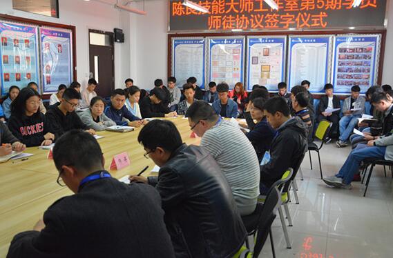 工作室领衔专家陈良大师在总结发言中讲到,今天是一个特殊的日子,中共中央办公厅、国务院办公厅在今天印发了《关于提高技术工人待遇的意见》,各位师傅(教练)—徒弟(学员)以正式文本形式确立了师徒关系。在举国高度重视技术技能人才、着力提高技能领军人才待遇水平的大好形势下,工作室迎来了第五期正式学员,也是国家级大师工作室成立后的第一批徒弟。导师-项目制是我们工作室卓有成效的做法,培养了一批有一批优秀学员。期望第五期学员按照协议,遵从“六讲六不”(讲理想信念、讲尊师重道、讲职业操守、讲用户至上、讲创新创造、讲精益求精,不作假、不贪功、不浮躁、不放弃、不懈怠、不粗浅),立足创新创造,实践“劳动创造世界、技能成就未来”,早日成才。