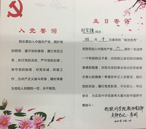 每名党员有两个生日,一个是自然生日,一个是政治生日。一个昭示着生命的开始,一个代表着在党的初心。自然生日不能忘,我们要感恩父母,回报社会;政治生日也不能忘,我们要不忘初心、牢记使命。物联网学院教师党支部把给党员过政治生日当成本年度基层党组织建设的重点工作来落实,从建立全体党员生日台帐到定制专用生日贺卡,从重温入党誓词到深入的谈心谈话,力争通过此项活动帮助全体党员进一步牢固树立”四个意识“,再一次提醒每位党员肩上担负的责任和使命。
