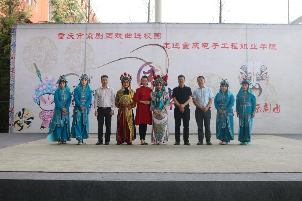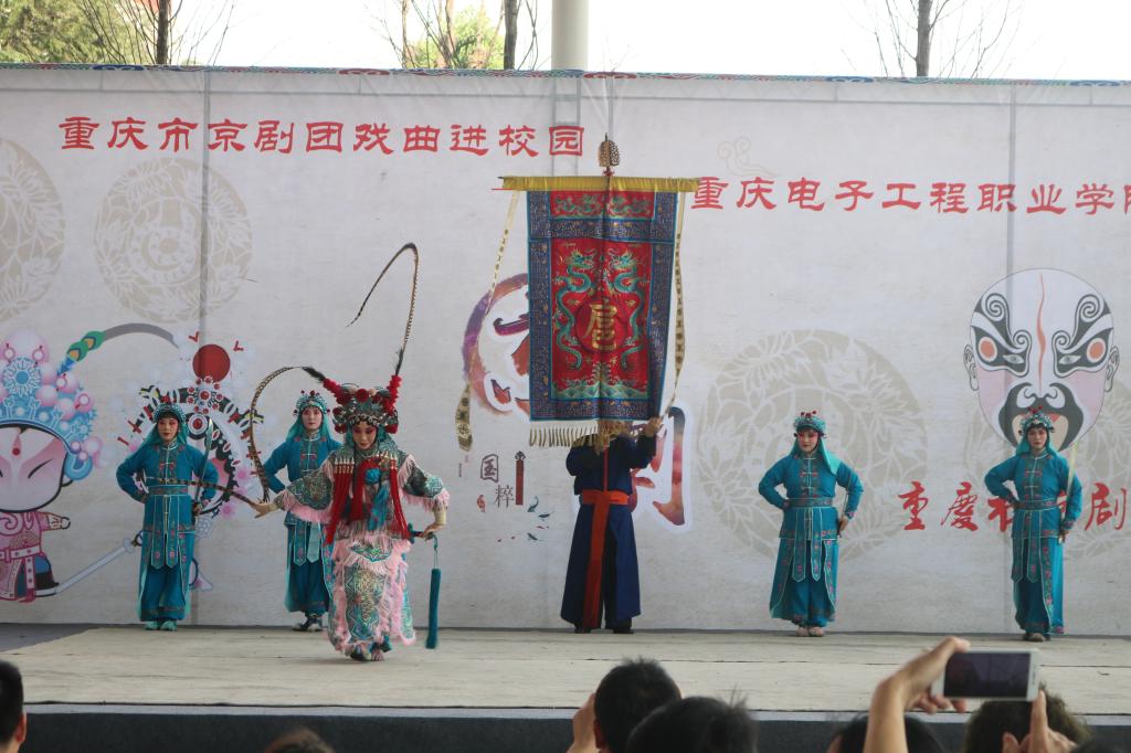 为引导广大师生弘扬传统文化、坚定文化自信,2018年4月19日14时,“戏曲进校园——重庆市京剧团走进重庆电子工程职业学院”京剧专场演出在我校风雨篮球场举行。校党委副书记唐玉林,副校长冉学农,党委组织统战部部长刘洪光,校党委学生工作部副部长蒋斌,校党委学生工作部副部长、校团委书记钟佐彬以及我校师生代表共计1200余人观看演出。