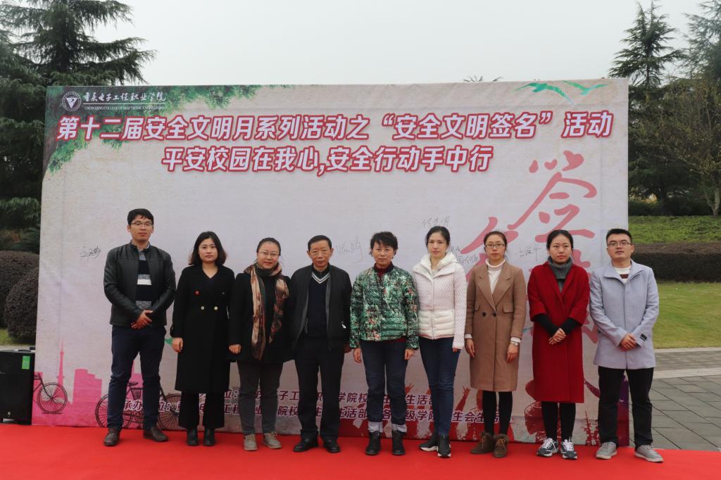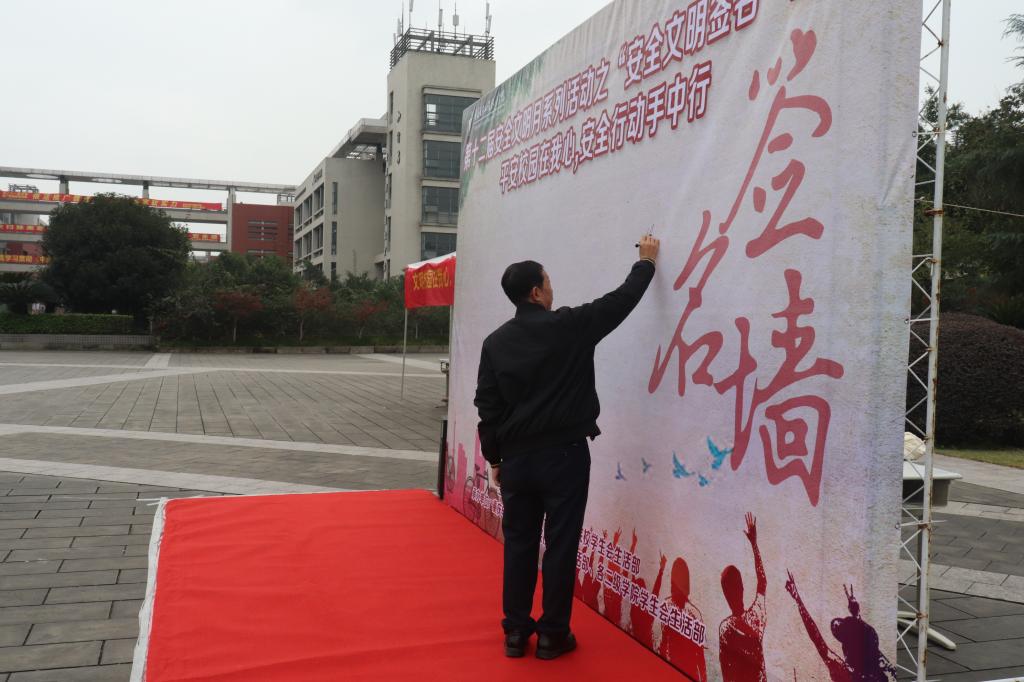 最后,由各位领导、老师、学生干部代表、学生代表在签名墙上签字,以示建设安全文明校园从自己做起,并合影留念。