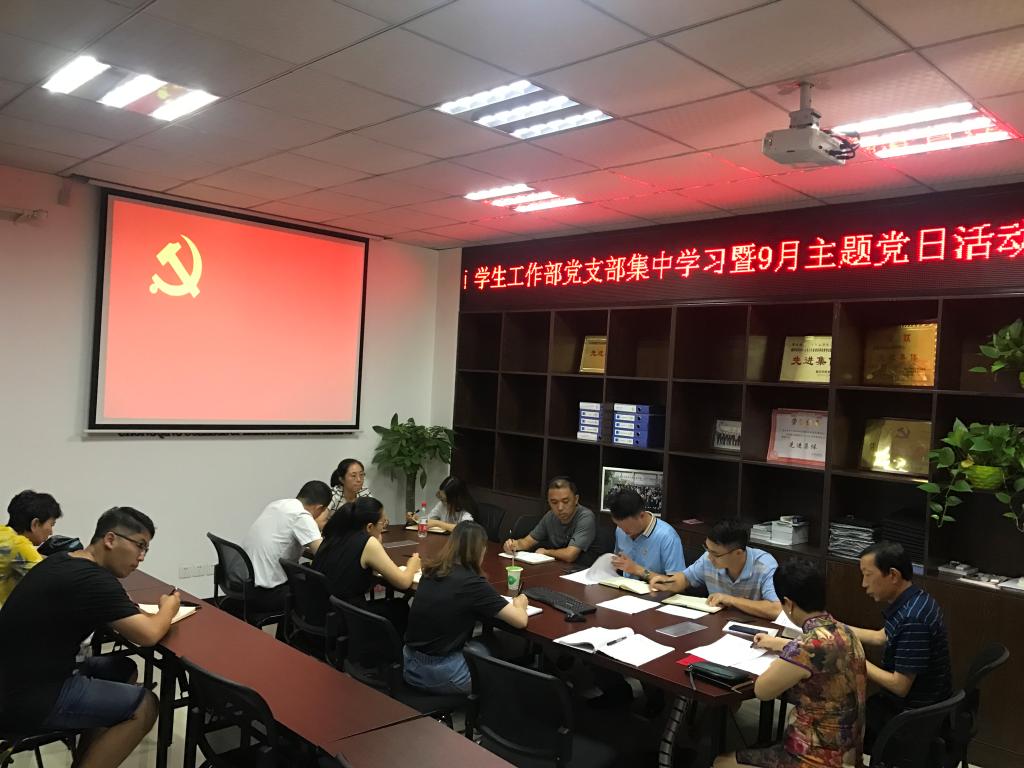 2019年9月12日下午,学工部党支部在7201会议室组织开展集中学习暨9月主题党日活动。学工部党支部全体党员同志参加了主题党日活动,副校长谢义华以普通党员身份参加了主题党日活动。主题党日活动由支部书记何光明同志主持。
