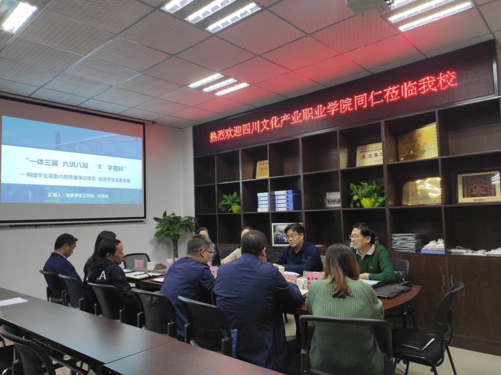 副校长冉学农对四川文化产业职业学院同仁们的到来表示热烈欢迎,并就我校的校情、校史、师资队伍建设、人才培养模式、历年办学成果等方面作了详细介绍。党委学工部部长何光明作了题为《“一体三翼六讲八双‘8’字循环”——构建学生层面内部质量保证体系  促进学生全面发展》的交流报告。双方就学校学生素质教育管理情况、辅导员队伍建设等方面进行了深入探讨。