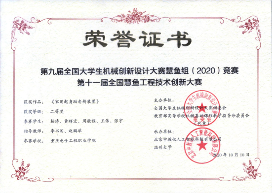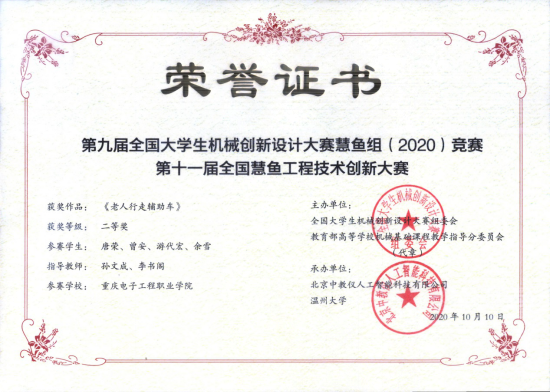 第九届全国大学生机械创新设计大赛慧鱼组(2020)竞赛暨第十一届全国慧鱼工程技术创新设计大赛在温州大学落下帷幕。我校智慧健康学院赵鹏举、李书阁、孙文成老师指导的,杨涛、黄辉宏、曾安、唐荣等同学组成的两支参赛队在赛前精心准备,克服多重困难,努力完成参赛任务,提交的两个参赛作品“家用起身助老椅装置”和“老人行走辅助车”具有一定的创新型、实用性和推广价值,得到竞赛评审专家的一致好评,最终获得全国二等奖两项。