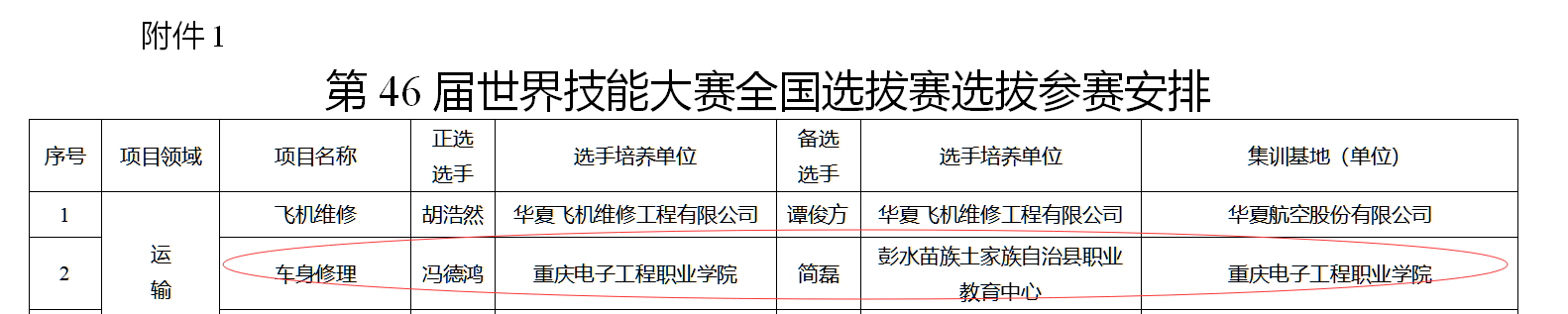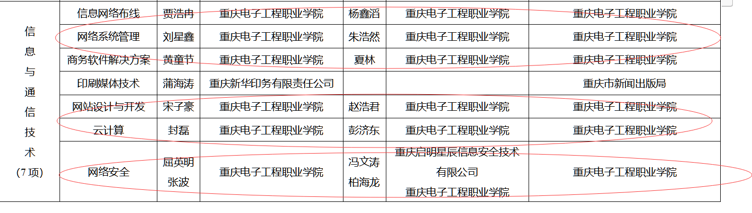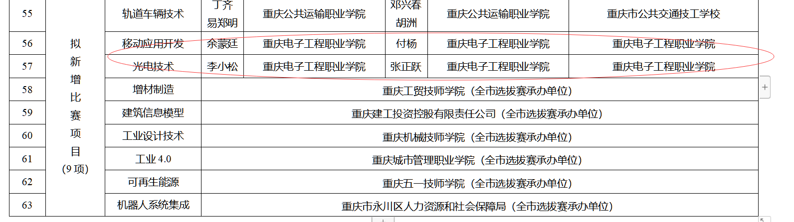 根据《重庆市人力资源和社会保障局办公室关于做好中华人民共和国第一届职业技能大赛等国家级赛事备战参赛工作的通知》渝人社办〔2020〕222号,目前已完成第46届世界技能大赛全国选拔赛的重庆市选手选拔工作中我校获得车身修理、信息网络布线、网络系统管理、商务软件解决方案、网站设计与开发、云计算、网络安全、移动应用开发和光电技术等9个项目的参赛正选选手。