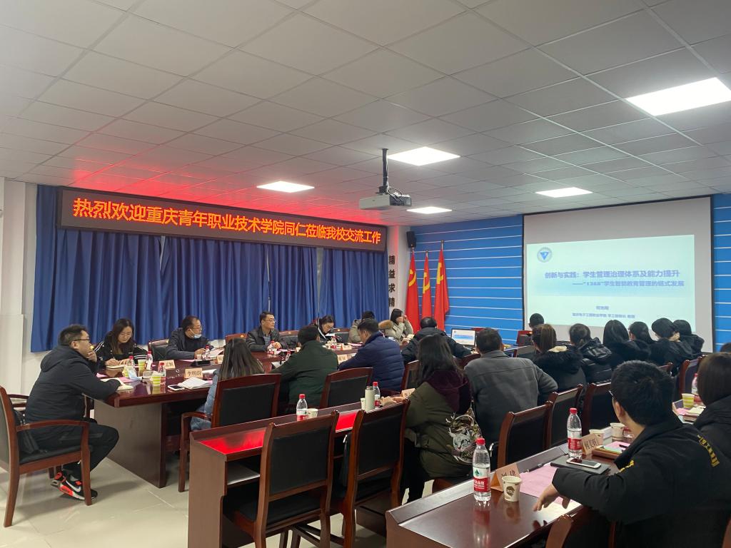 冉学农副校长对重庆青年职业技术学院同仁们的到来表示热烈欢迎,并就我校的整体情况、历史沿革、办学规模、历年办学成果等方面作了介绍。党委学工部部长何光明作了题为《创新与实践:学生管理治理体系及能力提升——“1368”学生智能教育管理的链式发展》的交流报告。双方就辅导员的考核与管理、辅导员培训晋升、学生管理系统信息化建设等方面进行了深入探讨。
