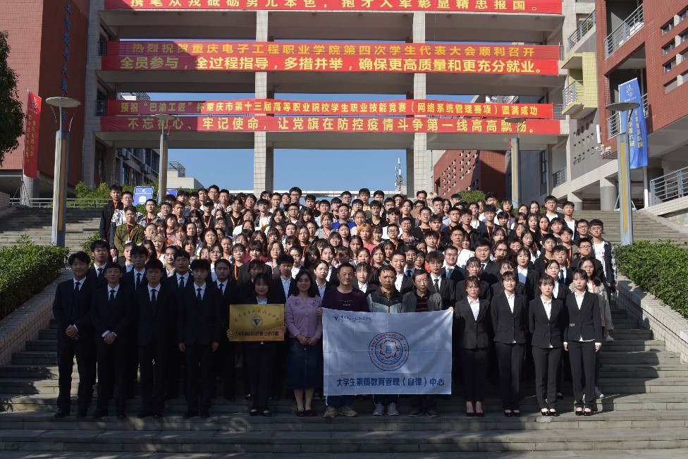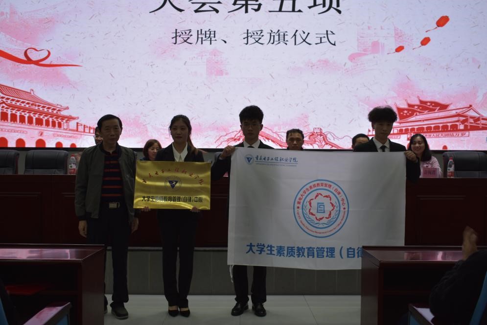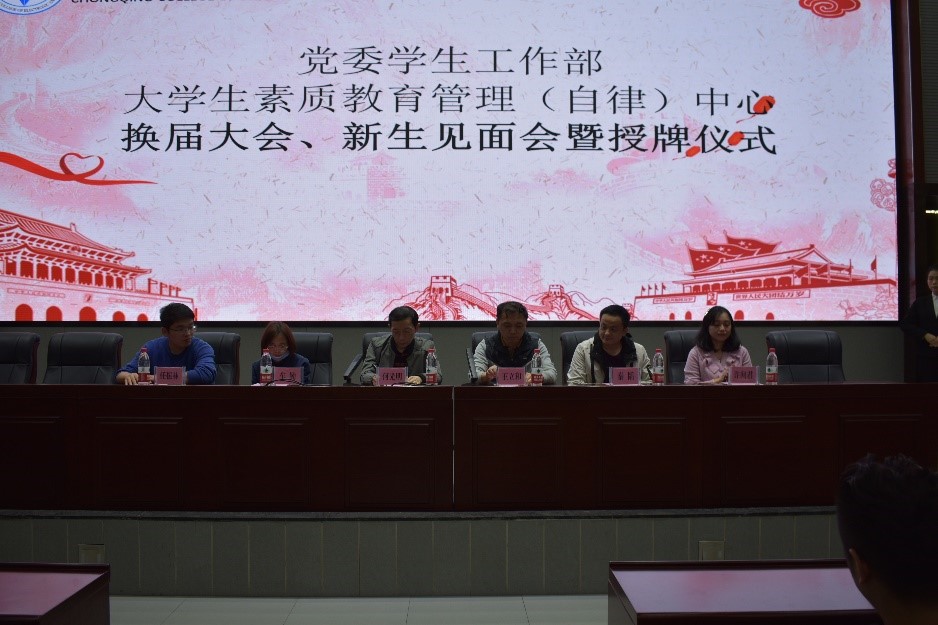 2020年11月11日,我校在博远厅举行了大学生素质教育管理(自律)中心换届大会、新生见面会暨授牌仪式。重庆电子工程职业学院党委学生工作部何光明部长、党委学生工作部宿管中心王立和主任等莅临现场,各校级组织、各二级学院主席团、生活部以及大学生素质教育管理(自律)中心全体成员参加了此次大会。