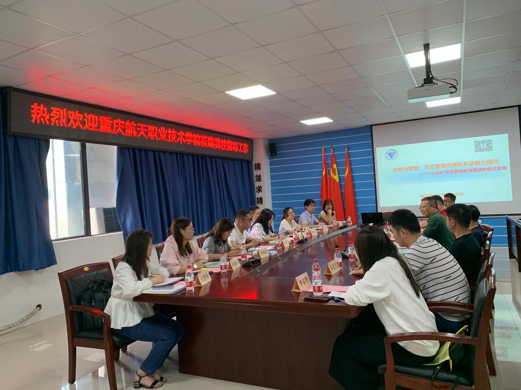 冉学农副校长对重庆航天职业技术学院同仁们的到来表示热烈欢迎,并就我校的整体情况、历史沿革、办学规模、历年办学成果等方面作了介绍。何光明部长对我校学生管理工作方面的亮点特色进行了交流,并作了题为《创新与实践:学生管理治理体系及能力提升——“1368”学生智能教育管理的链式发展》的交流报告。双方就全国职业院校学生管理50强的经验、学生素质教育管理情况、辅导员队伍建设、等方面进行了深入探讨。