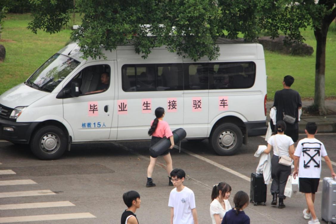 根据学校安排,党委学生工作部在校内南、北校区交界处设置摆渡车接驳点,三辆公交车轮流接送,为学生提供行李托运服务。除送站服务外,党委学生工作部还在4栋学生公寓门口和南门设立爱心服务站,安排大学生素质教育管理(自律)中心学生干部为毕业生服务,帮助毕业生搬运行李,让毕业生感受到母校浓浓关爱之情。
