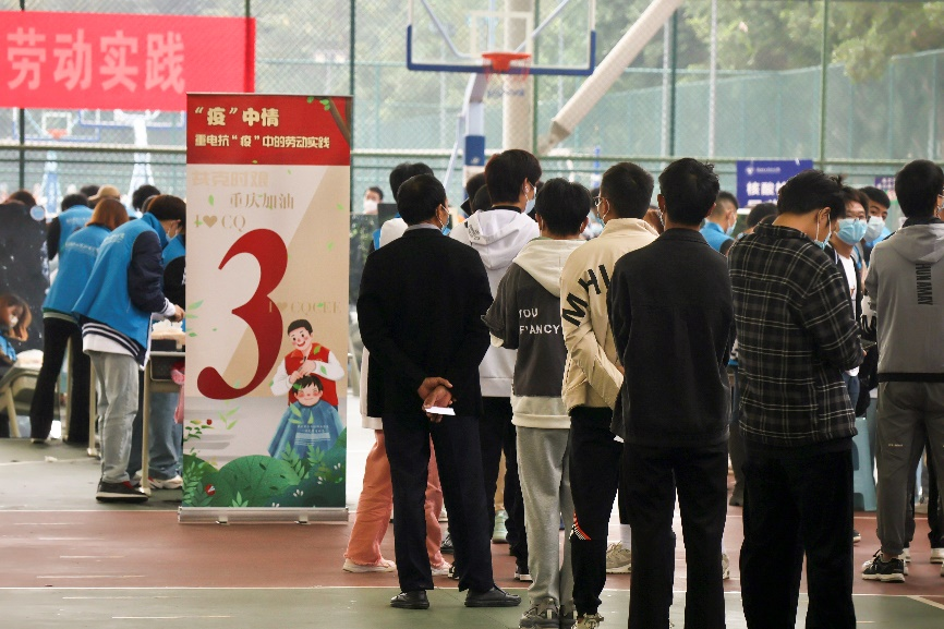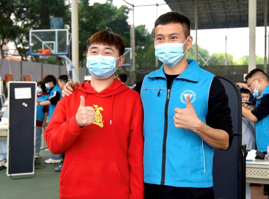 11月23日中午,重庆电子工程职业学院风雨球场上一片繁忙的景象,127名志愿者身披马甲、戴着口罩,正熟练地为师生理发。