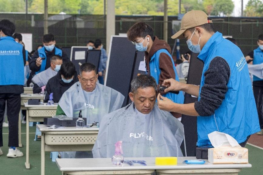 志愿者正在为师生理发 志愿者为学校后勤工作人员理发