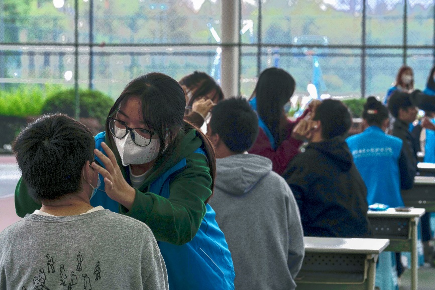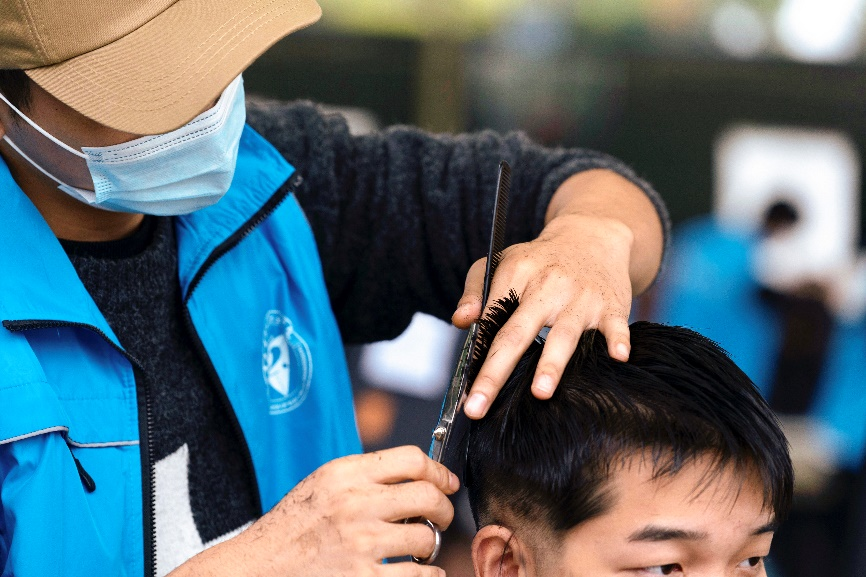 为了减少师生等待的时间,理发师们来不及休息,持续投入“战斗”。经过三个小时的连续奋战,现场服务人数接近600人,截至目前已累计服务1200余人次。来自特设党支部党员在现场自发组成志愿者队伍,随处可见党员们忙碌的身影,有的在帮助清理现场垃圾,有的在维持理发秩序,有的在提醒现场师生佩戴好口罩保持安全距离。