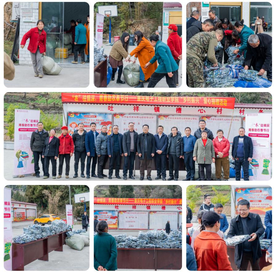 座谈会结束后,冉学农一行在吐祥镇槽心村开展了“‘衣’往情深,青春助农奉节行”爱心赠衣仪式。我校为村民准备的1000余套迷彩服整齐地摆放在槽心村村委会院坝中。在槽心村第一书记任振林的组织下,村民们早早地来到了村委会。随后,冉学农、何光明等领导为村民们发放迷彩服,拿到衣服的村民们喜笑颜开,三五成群迫不及待地进行试穿。村民高兴地说,“以前干活的时候都是穿旧衣服,很容易就被磨破了,这些迷彩服用料特别扎实,穿上迷彩服我们更能甩开膀子干了!”驻村第一书记任振林向学校表示感谢,他说,“眼下正值春耕,是村民们下地劳作的时节,这一批迷彩服来得十分及时,解决了村民们的燃眉之急。”