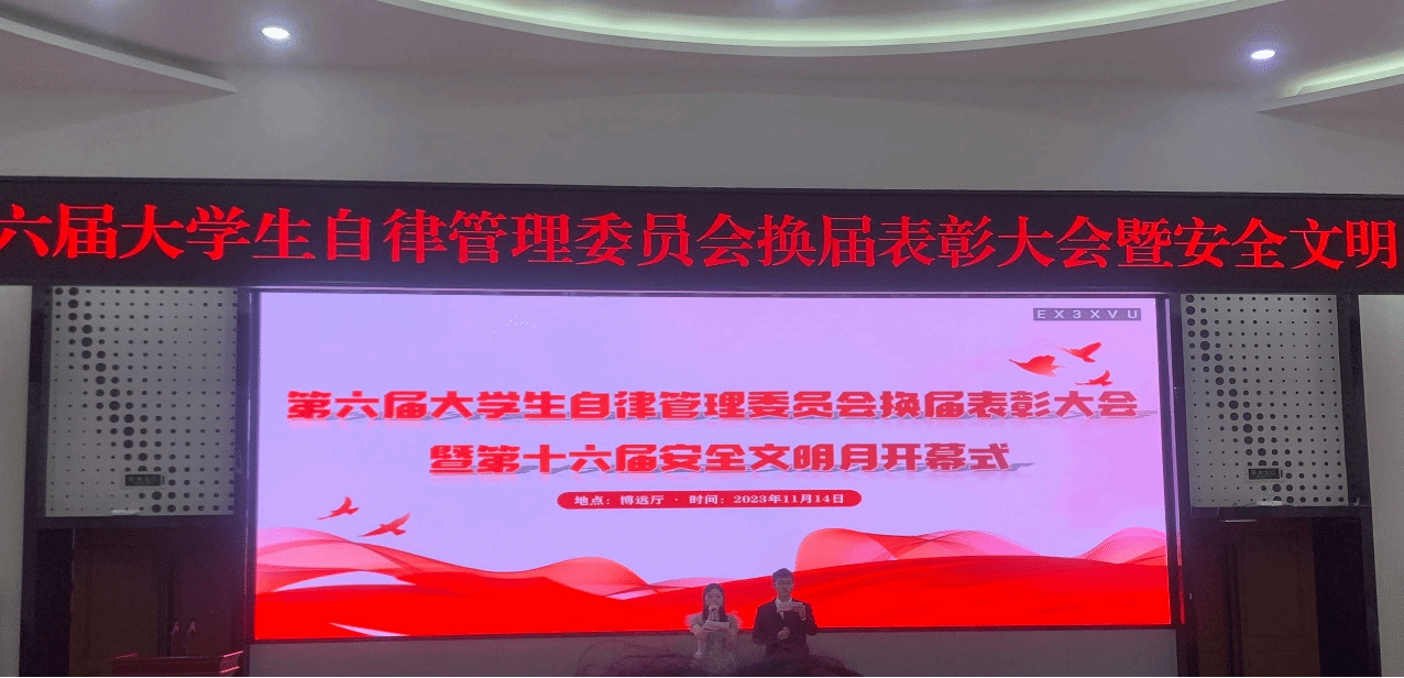 2023年11月14日,重庆电子工程职业学院第六届大学生自律管理委员会换届表彰大会暨第十六届安全文明月开幕式在博远厅顺利举行。学校冉学农副校长、党委学生工作部王永中副部长(主持工作)、党委学生工作部蒋斌副部长、党委学生工作部江兵副部长、党政办公室校友办马玲科长、党委宣传部网络舆情科肖罕科长、安全保卫处消防管理科赵宝鹏科长,以及各二级学院学管科科长、老师和学生代表、第五届和第六届大学生自律管理委员会全体学生成员出席此次活动。