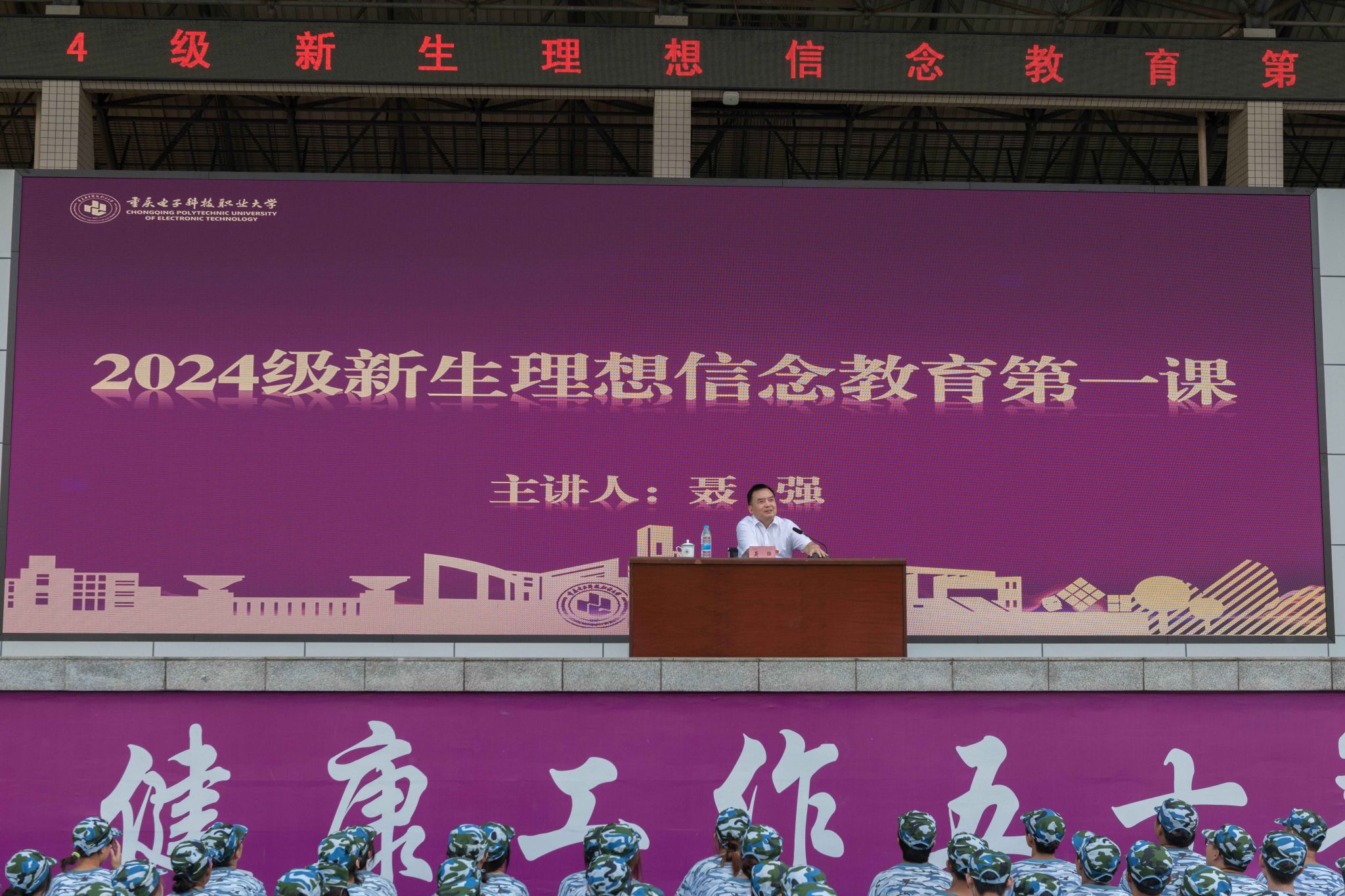 9月27日,重庆电子科技职业大学党委副书记、校长聂强教授以“鸿鹄应思搏云霄,振翅展飞千万里”为题,在奕晖运动场为2024级新生上理想信念教育“第一课”。