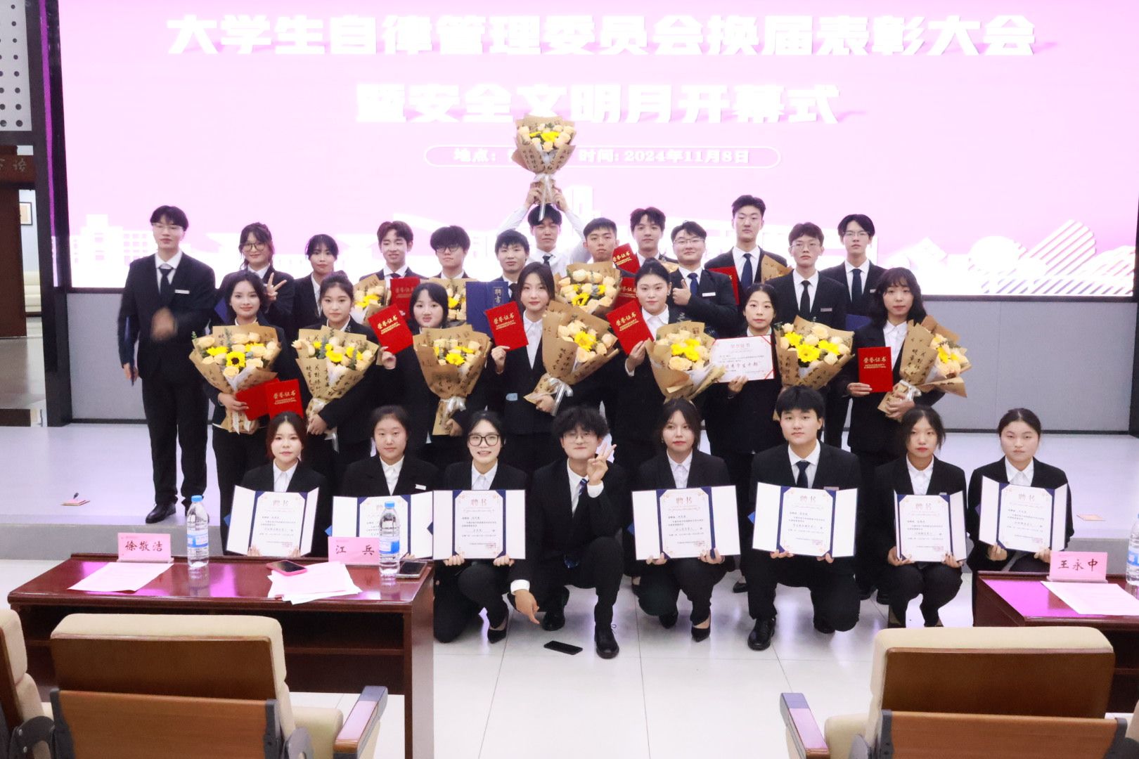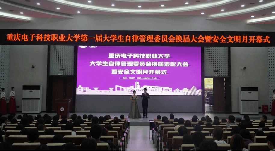 2024年11月8日,重庆电子科技职业大学第一届大学生自律管理委员会换届表彰大会暨安全文明月开幕式在博远厅顺利举行。党委学生工作部部长王永中、党委学生工作部副部长江兵,党委宣传部融媒体科负责人刘雅涵、安全管理处综合科科长徐敬洁,各学院学管科科长、辅导员代表,各学院学生组织代表及大学生自律管理委员会全体学生成员参加此次活动。