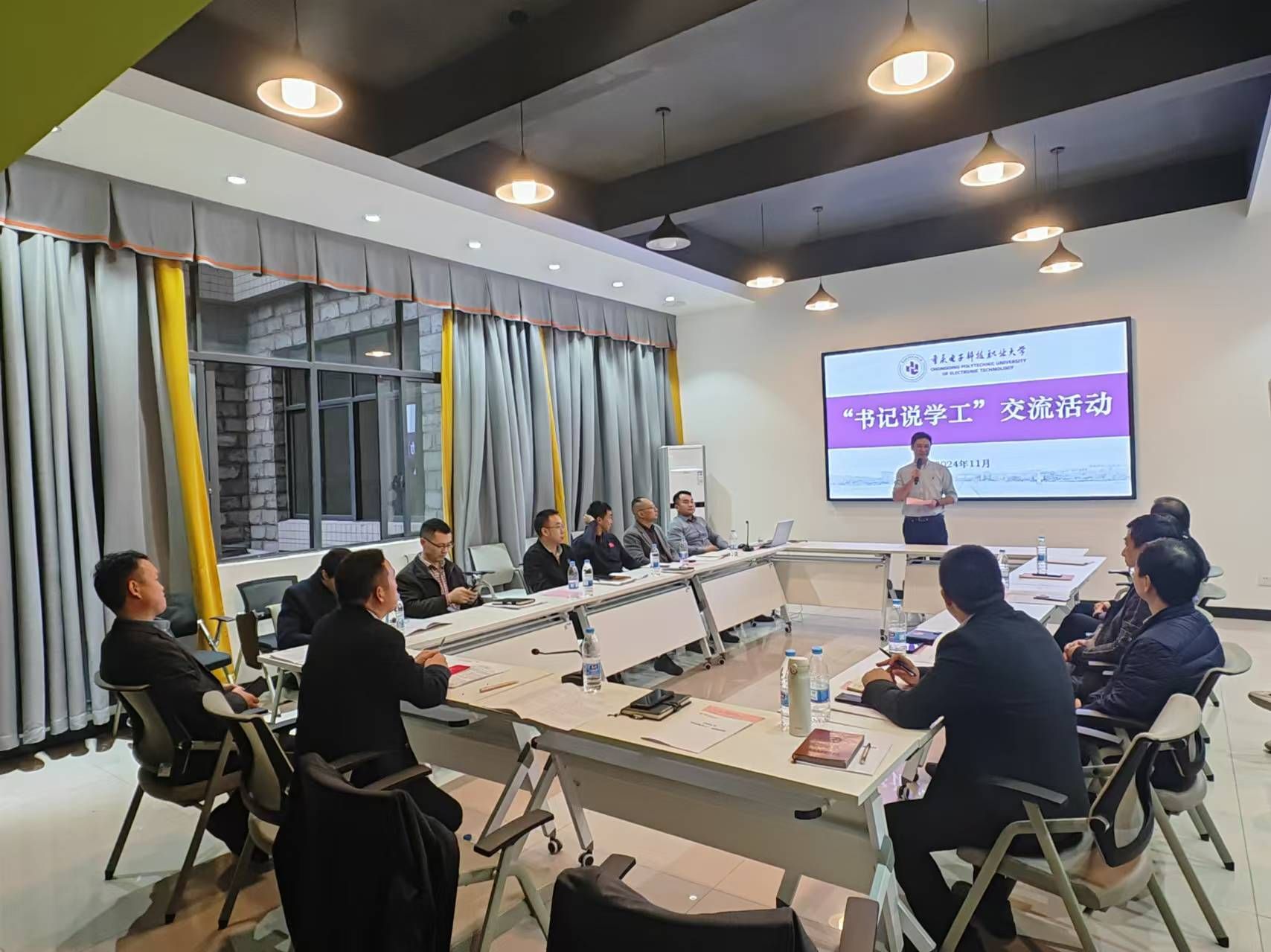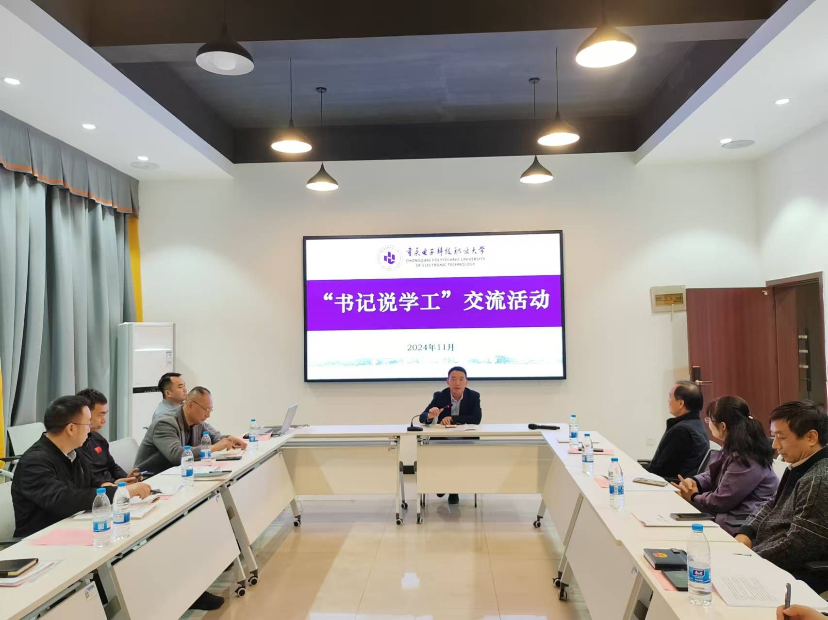2024年11月15日,重庆电子科技职业大学首届 “书记说学工” 活动在知行楼C120心理咨询中心热烈展开,为深入推进学校学生工作打开了新思路、新视野。参加本次活动的人员有黄爱明副校长、党委学工部副部长江兵以及各实体性二级学院书记、副书记。