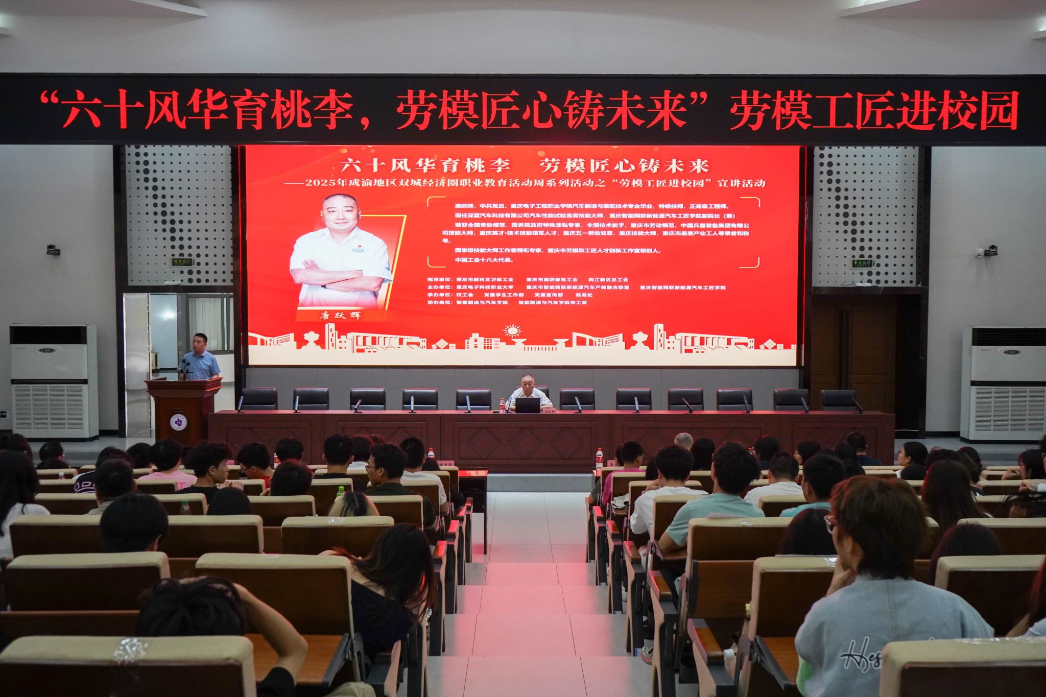 2025年5月12日下午,重庆电子科技职业大学党委学生工作部、校工会、党委宣传部、教务处等多部门联合主办,智能制造与汽车学院承办的“六十风华育桃李 劳模匠心铸未来”——2025年成渝地区双城经济圈职业教育活动周系列活动之“劳模工匠进校园”宣讲活动在重庆电子科技职业大学博远厅举行。学校副校长黄爱明、党委学生工作部等相关部门负责人、师生代表等300余人参加活动,共同聆听全国劳动模范、国务院政府特殊津贴专家、深蓝汽车首席技能大师唐跃辉的奋斗故事,感悟工匠精神的力量。