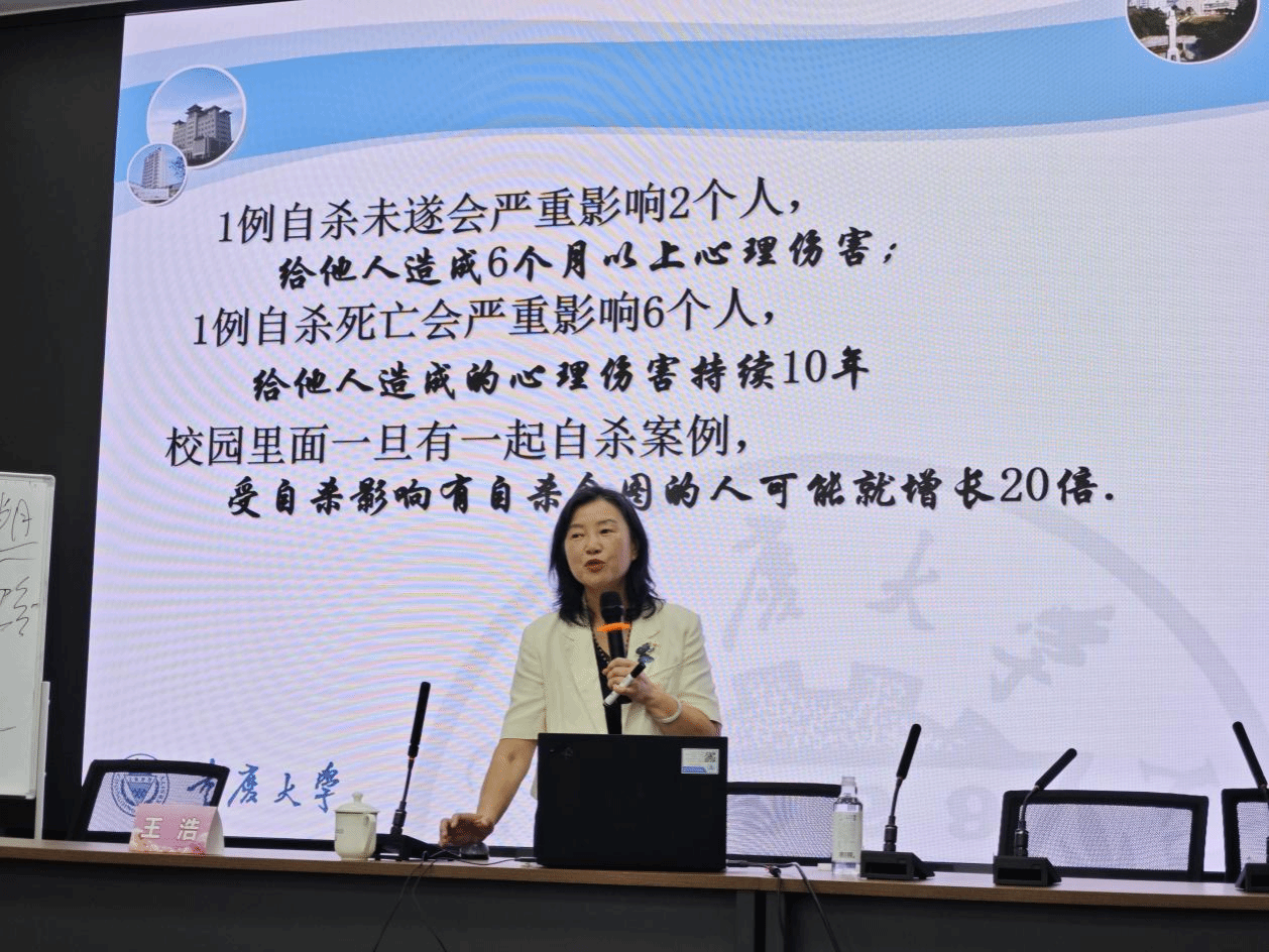 当前,大学生心理健康问题呈现复杂化、多样化趋势,如何精准识别危机信号、科学实施干预成为学生工作的关键课题。讲座中,王浩教授结合几十年的心理健康教育工作经验,以“危机即转机”为主题,系统梳理了心理危机的识别要点与干预策略。她通过生动的案例解析,深入浅出地讲解了学生危机干预的实践方法,并强调“以专业素养守护学生安全,以温暖姿态助力心理成长”的工作理念,为现场教师提供了兼具理论高度与实践深度的指导。