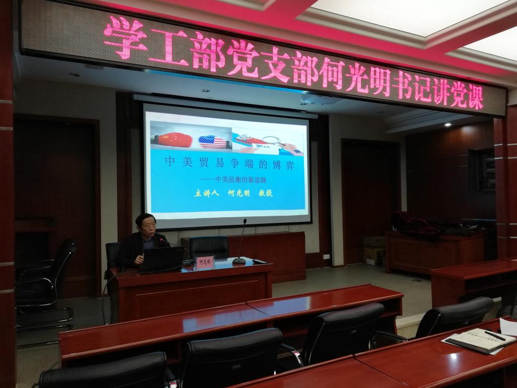 2018年10月19日下午,学工部党支部何光明书记在博润厅以《中美贸易争端的博弈——中美抗衡的新思路》为题给各二级学院书记、副书记、学管科科长全体辅导员、班主任进行党课培训。何书记分别就中美关系回顾、中美贸易战的基本情况、中美贸易战中方的举措以及中美关系的展望四个方面进行了生动的讲授。