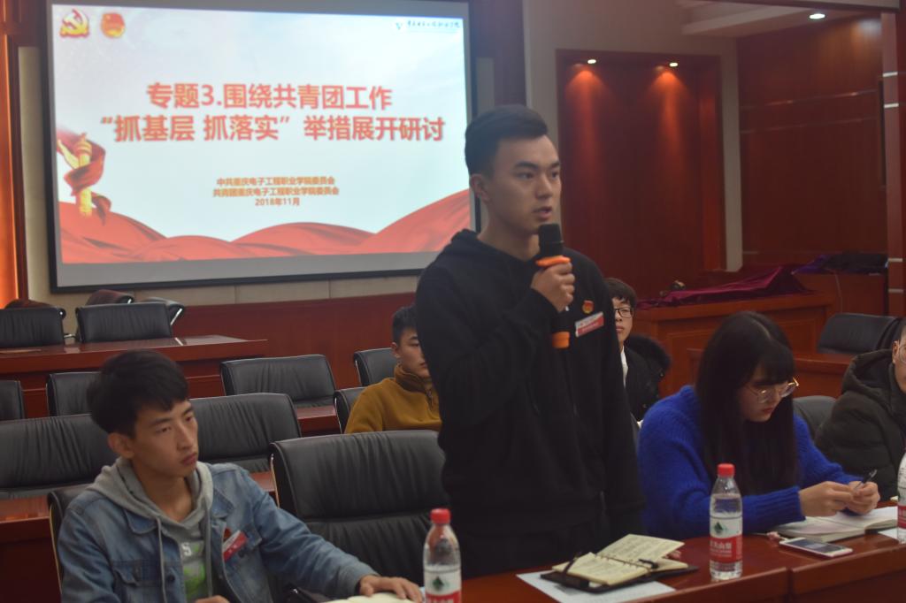 下午的专题研讨会主要围绕“共青团工作‘抓基层,抓落实’举措”展开,团委书记袁玉刚指出了目前基层团组织存在的一系列问题,强调共青团组织重点要加强政治建设和思想引领,提高理论学习和社会实践活动能力,做到知行合一。之后各二级学院团总支书记及主要学生干部依次反馈了基层团组织的意见及建议。
