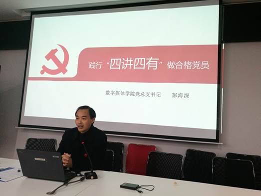 为了践行“三会一课”制度,坚定党员的理想信念,提高党员的自身修养,贯彻落实党的十九大精神,2018年12月6日,数字媒体学院党总支书记彭海深同志为学生党支部全体党员讲授了以“践行四讲四有,做合格党员”为主题的党课,学生党支部全体党员同志参会。