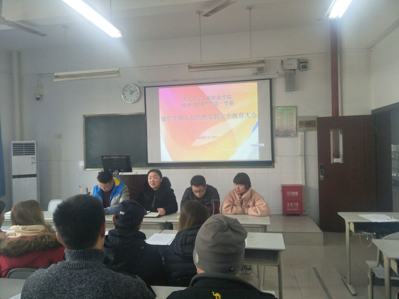为了让来华留学生度过一个安全、文明、祥和、愉快而有意义的假期,以崭新的面貌迎接新学期,2019年1月11日在南校区2305教室,通识教育与国际学院召开了重庆电子工程职业学院2018—2019学年第一学期留学生期末总结暨安全教育大会。党委学工部蒋斌副部长、安全保卫处田艾副处长、基建后勤处周洁副处长、通识教育与国际学院冉槐书记以及张华敏副院长和部分留学生班级任课老师出席了本次会议。