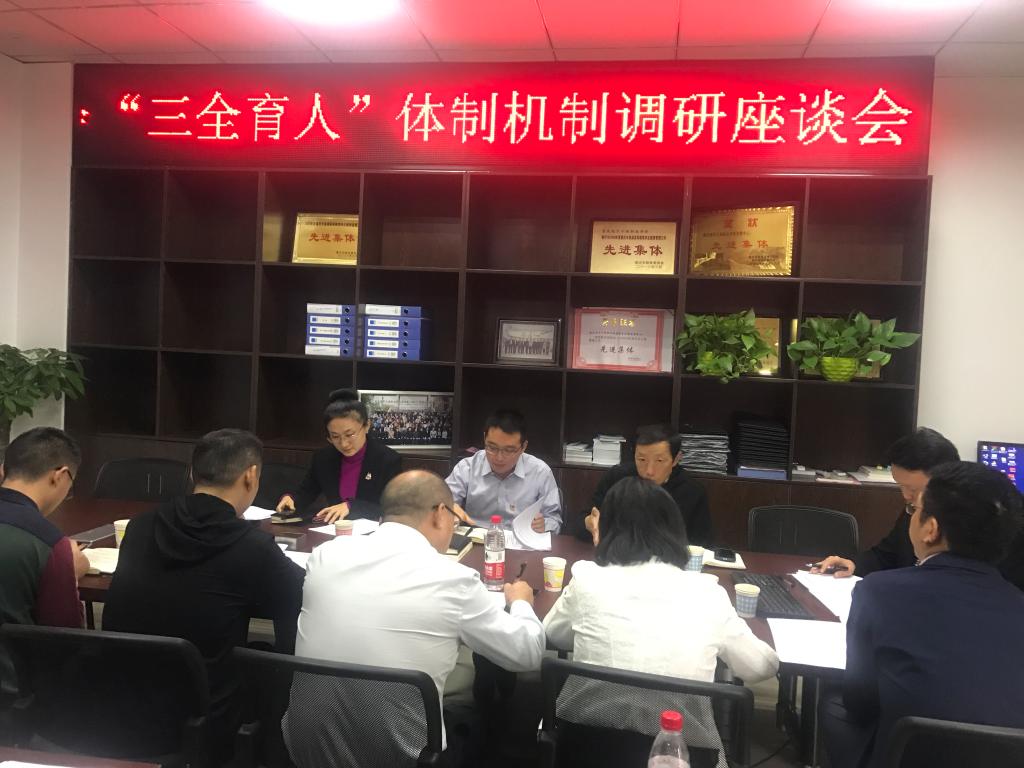 调研分两个阶段,第一阶段由各部门负责人就目前“三全育人”工作开展情况进行座谈交流,第二阶段副校长黄爱明作总结讲话。